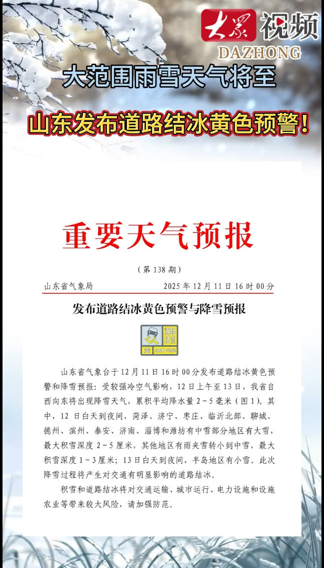 山东发布道路结冰黄色预警!11市有中雪部分地区大雪