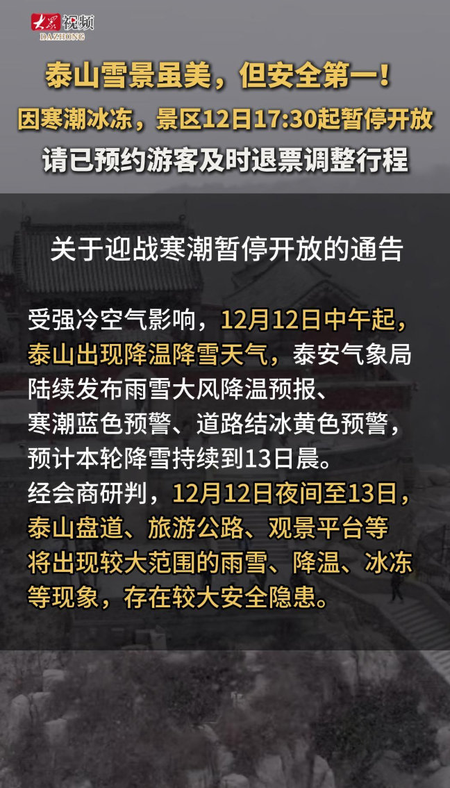 泰山雪景虽美,但安全第一!因寒潮冰冻,景区12日17:30起暂停开放,请已预约游客及时退票调整行程