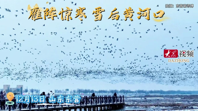 山东东营黄河口奇观——群雁雪幕中泼墨起舞放声齐鸣