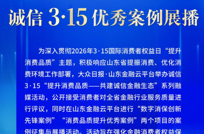 即日起,大众日报·山东金融云平台将开辟“提升消费品质——共建诚信金融生态”活动专题,旨在强化金融消费者权益保护,推动金融服务透明化、普惠化、数字化,增强消费者获得感与信任度,为山东经济社会高质量发展注入新动能,现面向金融机构进行全网征集。