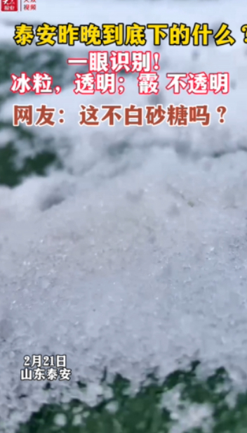 2月20日晚,泰安下起了雪,但所下的并非普通雪花,而是一粒粒晶莹剔透的小冰球,被网友们戏称为“白砂糖”。这种天气现象在气象学中被称为“霰”。专家解释,冰粒是透明的,霰不透明,你能识别出来吗?(大众日报·大众新闻客户端记者 王洪涛 实习生 马蔚 通讯员 王其勇 刘春莲 报道 )