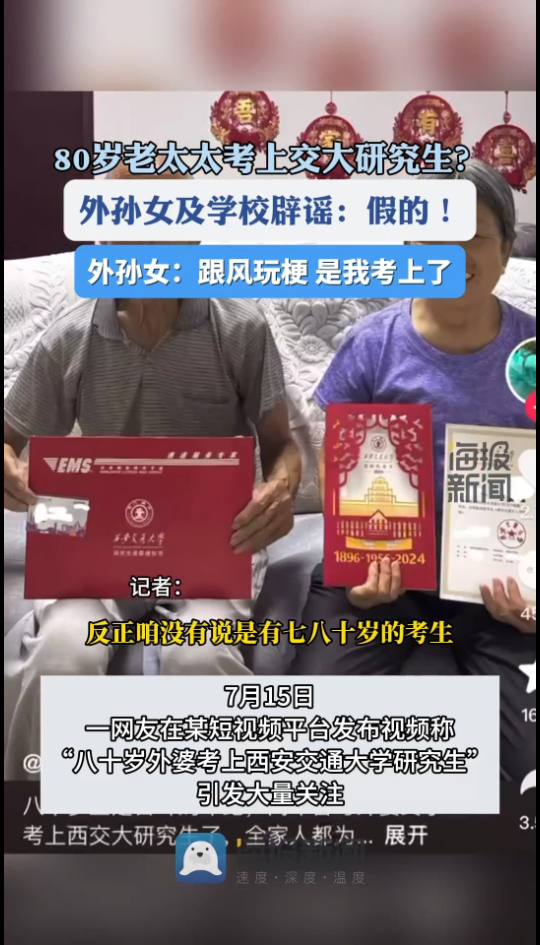 海报视讯丨80岁外婆考上西安交大研究生?外孙女辟谣:跟风玩梗,是我考上了
