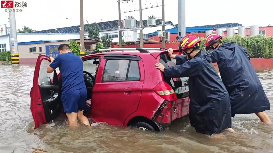 德州突降暴雨致汽车被困 消防员合力推车