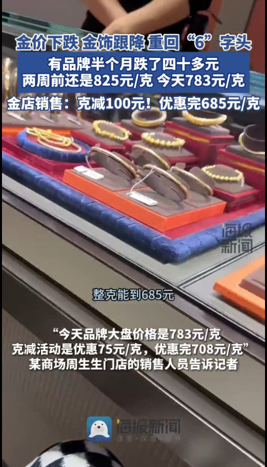 海量财经 | 金价下跌 金饰跟降 重回“6”字头!各品牌金价半个月跌了40元/克