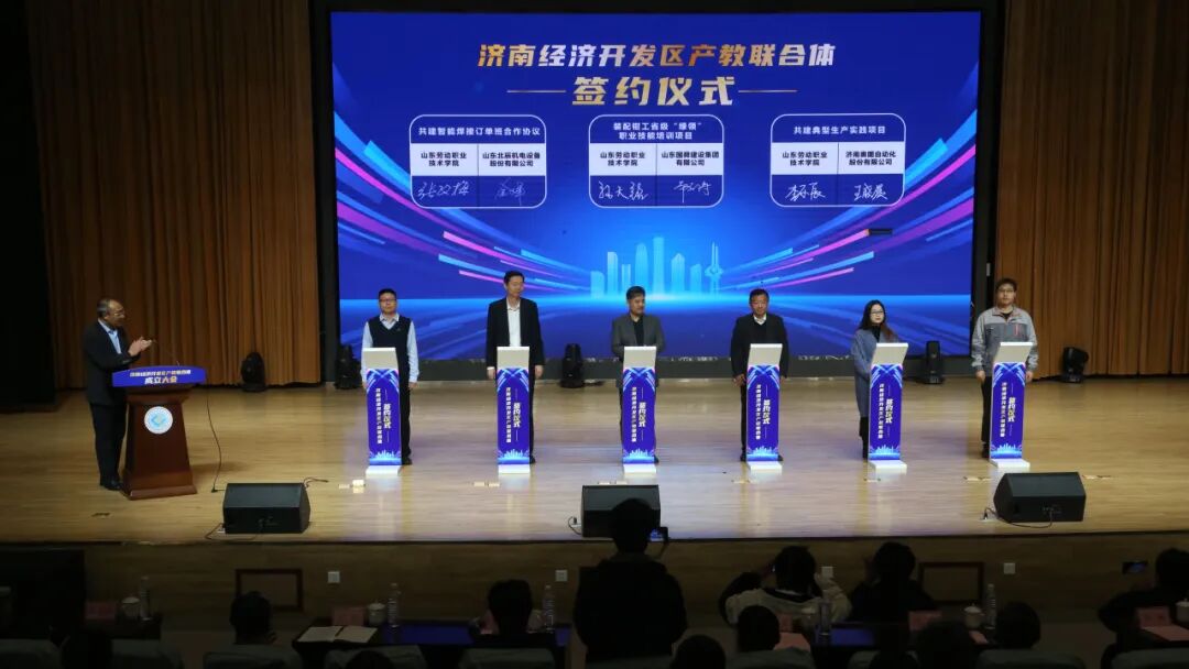 山东北辰机电设备股份有限公司副总经理金延军、山东劳动职业技术学院智能制造系主任张政梅共同签订共建智能焊接订单班合作协议;国舜绿建科技有限公司总经理卢圣涛、山东劳动职业技术学院智能制造系党总支副书记孙大铭共同签订省级“绿领职业技能培训合作项目协议”;济南奥图自动化股份有限公司部门总监王晓晨、山东劳动职业技术学院电气及自动化系教师代表李东辰上台共同签订共建典型生产实践项目协议。