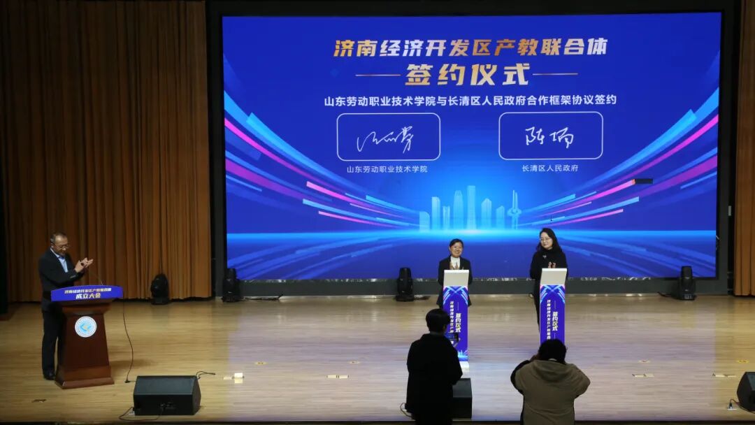 长清区人民政府副区长陈楠,山东劳动职业技术学院党委成员、副院长张丽芳共同签订合作框架协议。