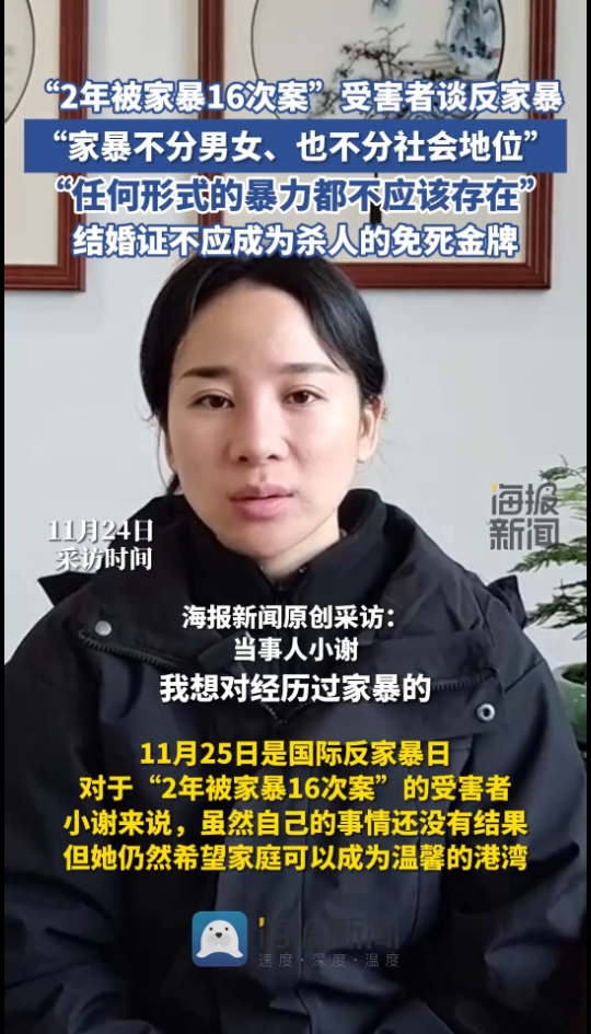 11月25日,是国际反家暴日。对于受到家暴侵害的小谢来说,虽然自己的事情还没有一个结果,但她仍然希望家庭可以成为温馨的港湾,而不是施暴的庇护所,结婚证也不应该成为杀人的免死金牌。