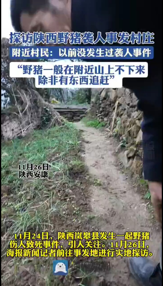 11月24日,陕西省安康市岚皋县发生一起野猪致人死亡事件。当天,一头野猪闯入岚皋县黄兴村一胡姓村民家中,致76岁的胡姓老人被顶撞撕咬致死。26日,海报新闻记者来到事发村庄进行走访。
