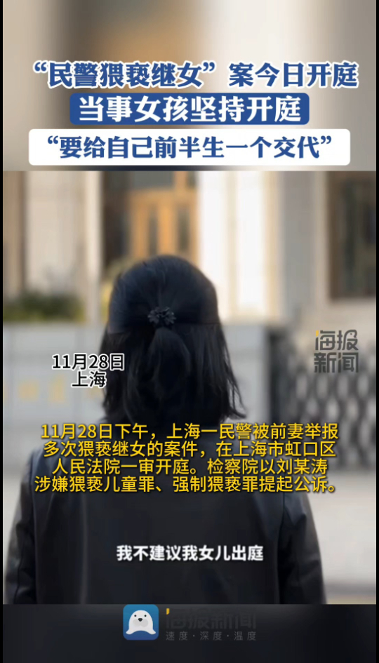 11月28日下午,上海一民警被前妻举报多次猥亵继女的案件,在上海市虹口区人民法院一审开庭。检察院以刘某涛涉嫌猥亵儿童罪、强制猥亵罪提起公诉。