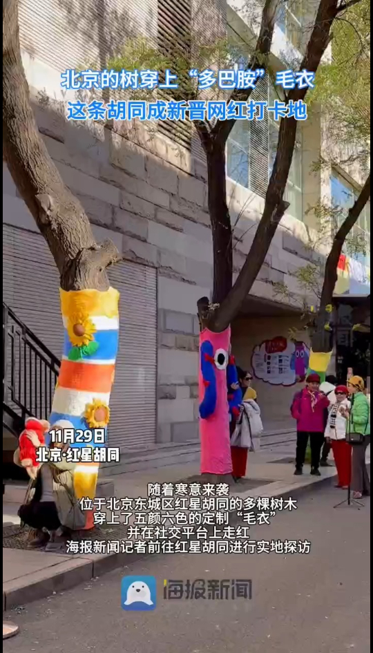 你见过树穿毛衣吗?随着寒意来袭,位于北京东城区红星胡同的多棵树木穿上了五颜六色的“定制毛衣”,并在社交平台上走红。11月29日,海报新闻记者前往红星胡同进行了实地探访。