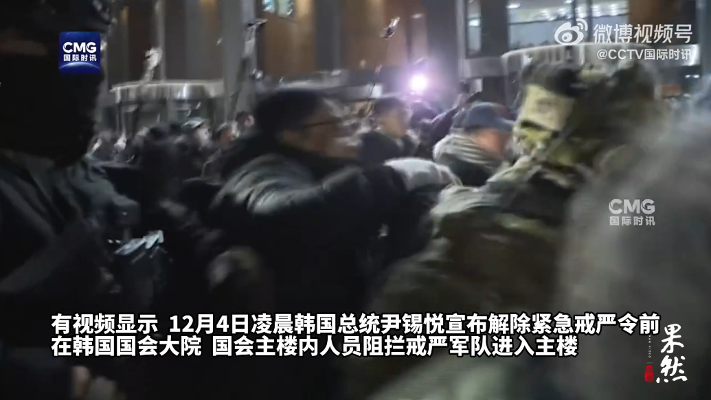 果然视频·看天下|韩国国会主楼内人员曾阻拦戒严军队进入齐鲁晚报·齐鲁壹点客户端 2024-12-04原创有视频显示,在12月4日凌晨韩国总统尹锡悦宣布解除紧急戒严令前,在韩国国会大院,国会主楼内人员阻拦戒严军队进入主楼。他们用桌椅沙发等物品堵住大门,还有人与军队发生冲突。有现场视频显示,部分韩国军人是破窗进入国会主楼的。