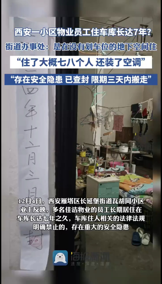 西安一小区物业员工住在车库长达7年?街道办:住了七八个人,还装有空调