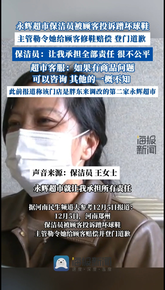 永辉超市保洁员被顾客投诉蹭坏球鞋,主管勒令她给顾客修鞋赔偿上门道歉,保洁员称很委屈