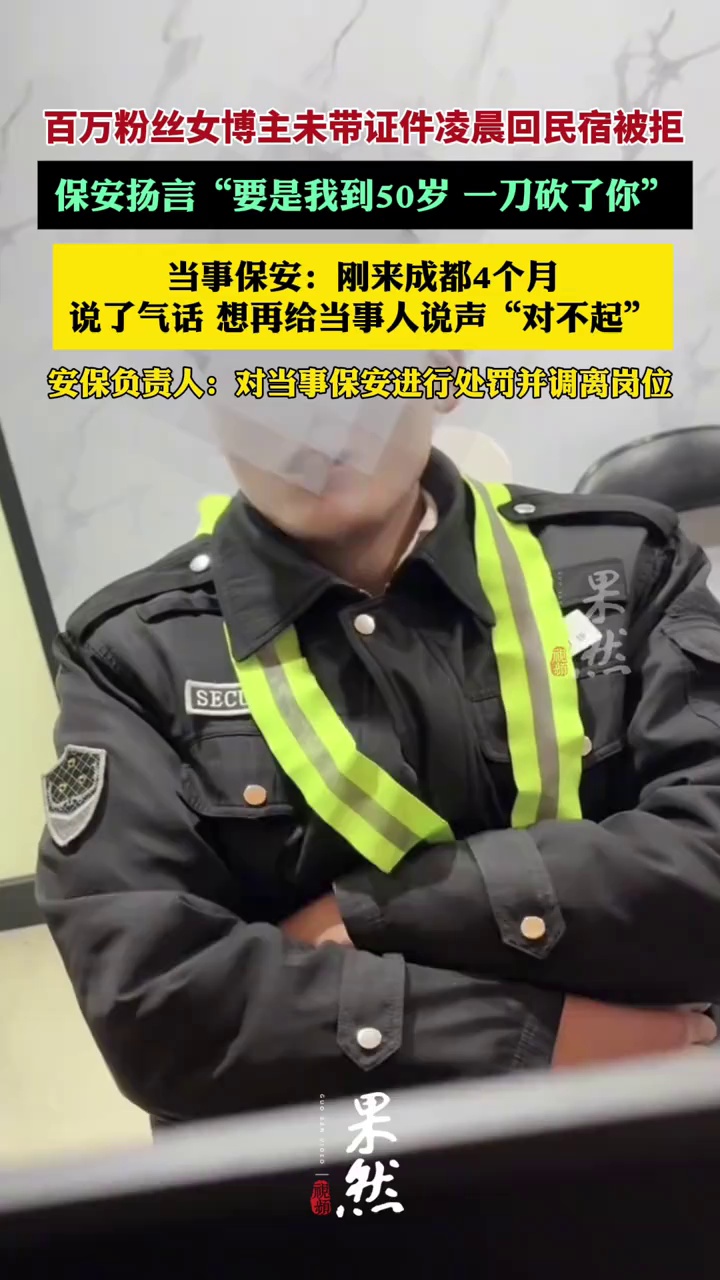 百万粉丝女博主未带证件凌晨回民宿被拒,保安扬言“一刀砍了你”