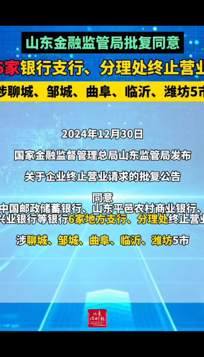 2024年12月30日,国家金融监督管理总局山东监管局发布关于企业终止营业请求的批复公告,同意中国邮政储蓄银行、山东平邑农村商业银行、兴业银行等银行6家地方支行、分理处终止营业,涉聊城、邹城、曲阜、临沂、潍坊5市。