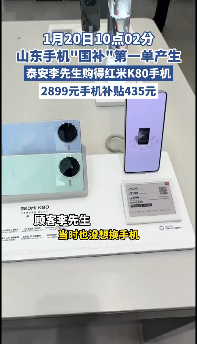 20日上午10点02分,在泰安五矿商场小米之家,市民李先生购得一款2899元的红米K80手机,按照15%的补贴政策,该款手机最终实付2464.15元。李先生成为山东首位享受到购机补贴政策的消费者,补贴后立减435元。
