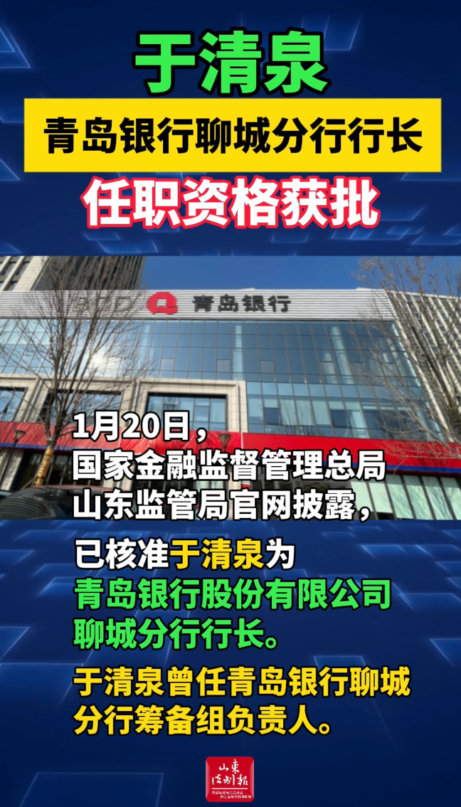 1月20日,国家金融监督管理总局山东监管局官网披露,已核准于清泉为青岛银行股份有限公司聊城分行行长。于清泉曾任青岛银行聊城分行筹备组负责人。