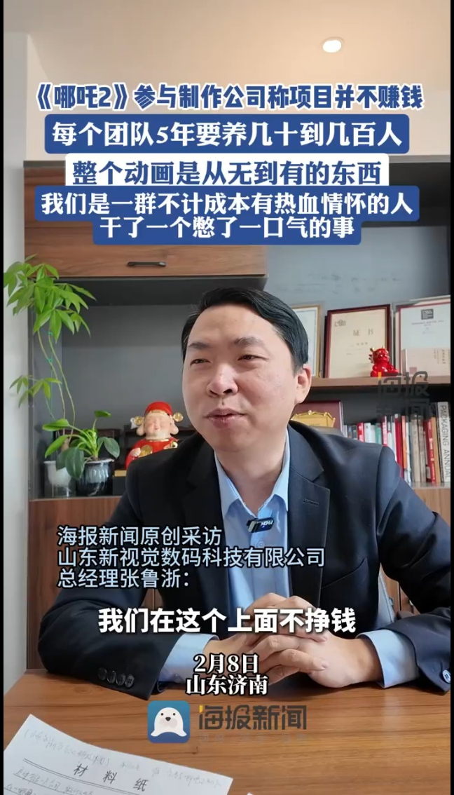 然而,作为其幕后的动画制作公司,是不是也会随着票房的飙升而“水涨船高”?2月8日,山东唯一一家参与《哪吒2》幕后制作的公司——山东新视觉数码科技有限公司总经理张鲁浙,告诉海报新闻记者,“像我们这种参与制作的外包公司,拿的都是制作部分的固定酬劳,其实并不多赚钱。”