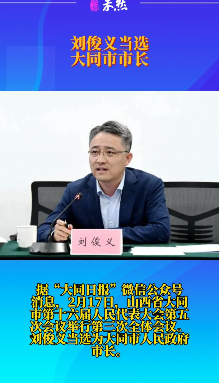 观政视频|“80后”刘俊义当选大同市市长齐鲁壹点 | 2025-02-18 原创齐鲁晚报·齐鲁壹点客户端 微信扫码扫码下载客户端据“大同日报”微信公众号消息,2月17日,山西省大同市第十六届人民代表大会第五次会议举行第三次全体会议。刘俊义当选为大同市人民政府市长。