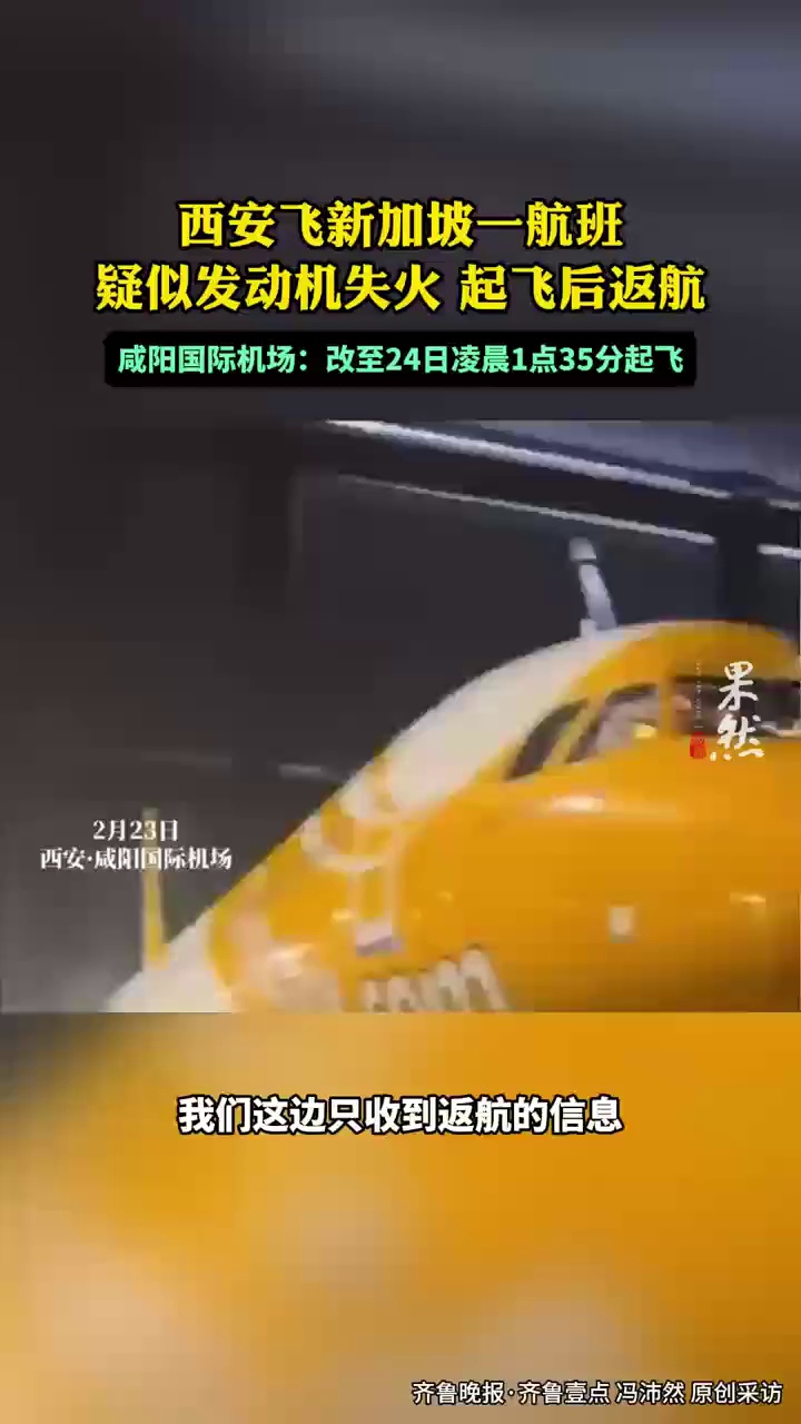 2月23日凌晨,陕西西安咸阳国际机场一架原定飞往新加坡的酷航TR135航班,起飞后疑发动机起火返航。当天上午,记者联系西安咸阳国际机场,客服答复称,酷航TR135航班确实发生了返航,但具体原因不清楚。这架航班计划于24日凌晨1点35分再次起飞。