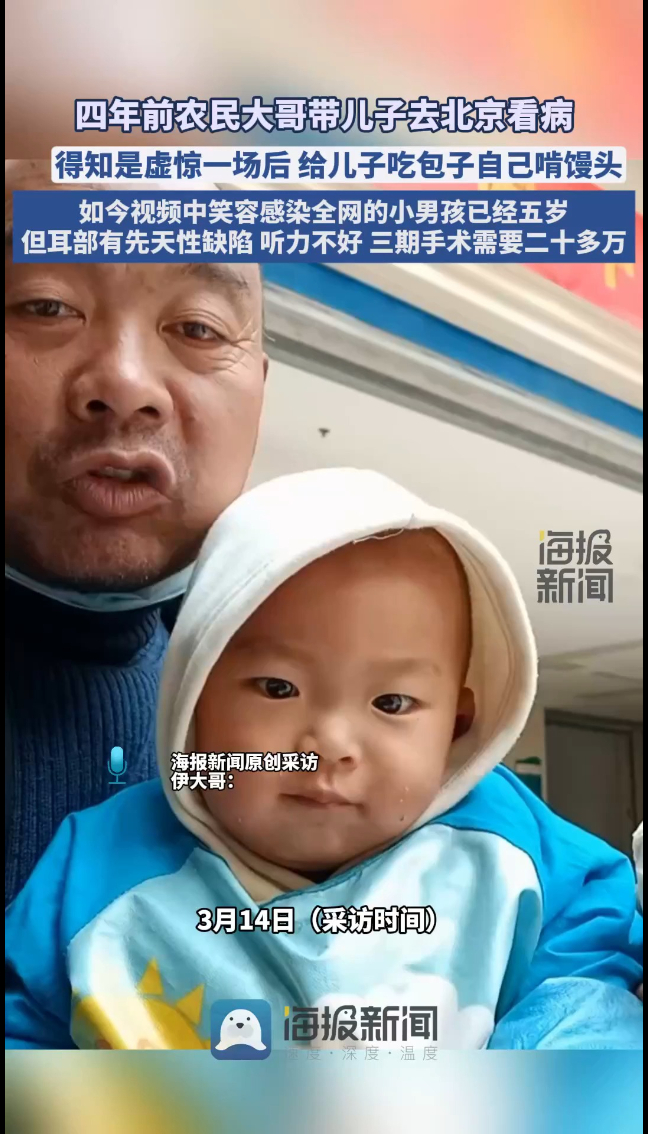 四年前在医院和爸爸啃包子的小男孩,先天性耳部缺陷,三期手术费需二十多万