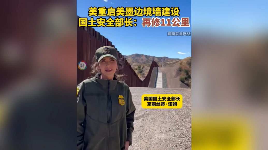 果然视频·看天下|美重启建设边境墙,将再修11公里 2025-03-18 原创齐鲁晚报·齐鲁壹点客户端 微信扫码扫码下载客户端美国国土安全部长克丽丝蒂·诺姆日前在社交媒体上发布一段视频,宣布美国将在亚利桑那州美墨边境增建7英里(约11.27公里)的边境墙:“我们将继续‘让美国再次安全’。”美国媒体报道说,这是特朗普政府重启边境墙建设。