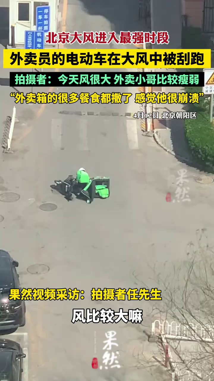 北京大风进入最强时段,外卖员的电动车在大风中被刮跑。拍摄者:今天风很大,外卖小哥比较瘦弱,外卖箱的很多餐食都撒了,感觉他很崩溃。(@瑞哥哥的世界很大 )