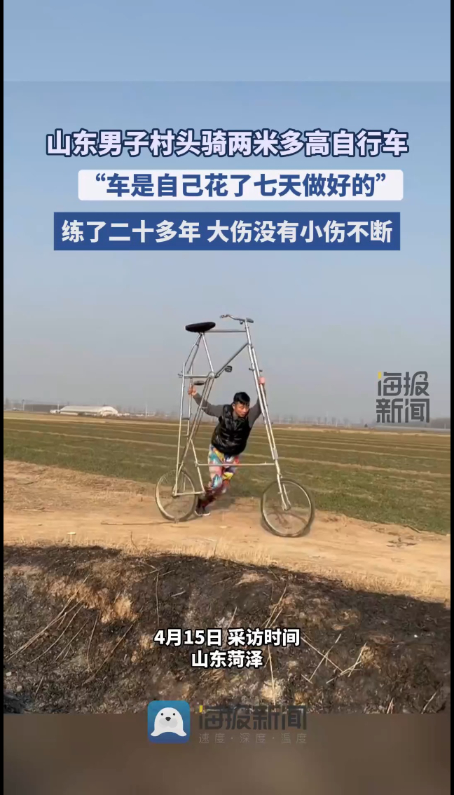 山东男子村头骑两米多高自行车:练了二十多年,大伤没有、小伤不断
