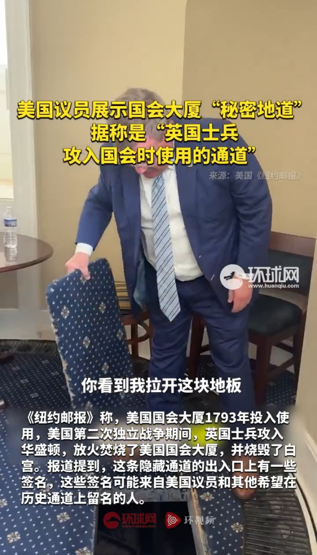 美国议员展示国会大厦“秘密地道”,据称是“英国士兵攻入国会时使用的通道”