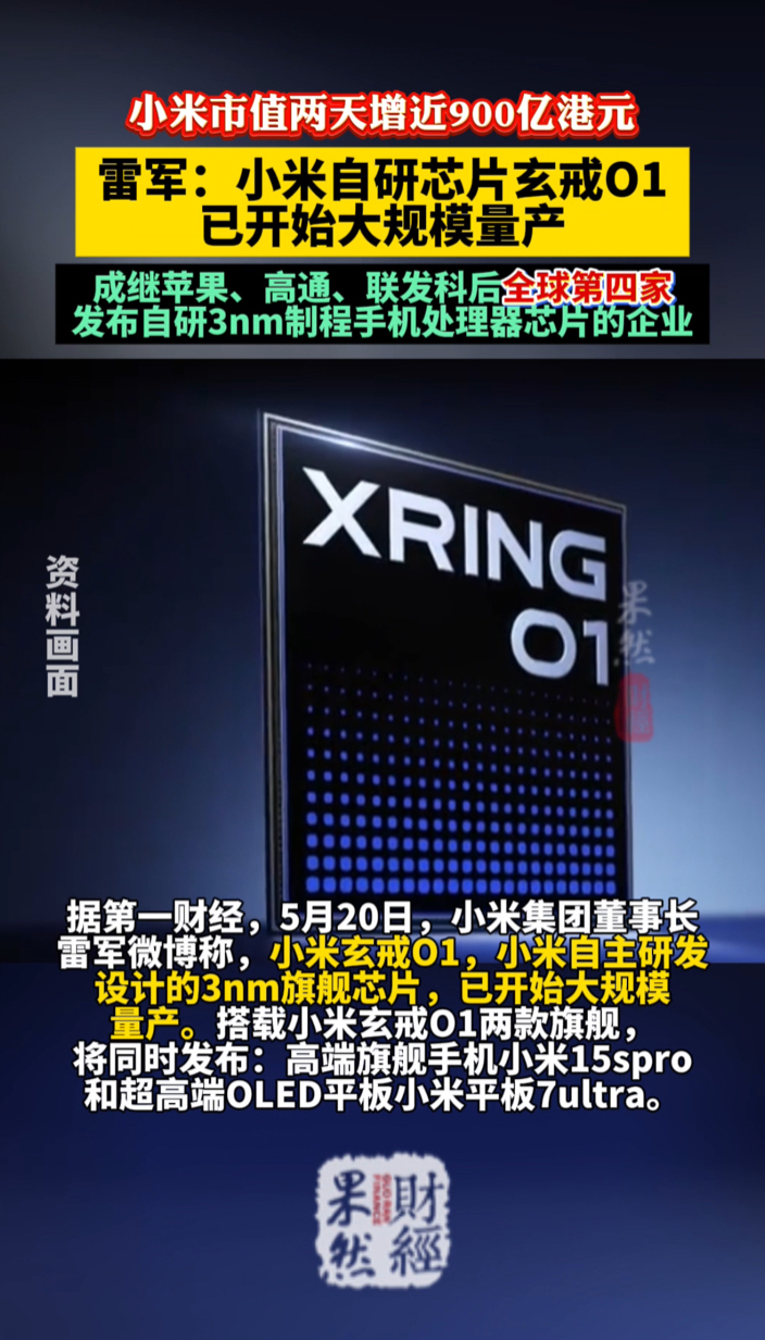 据第一财经,5月20日,小米集团董事长雷军微博称,小米玄戒O1,小米自主研发设计的3nm旗舰芯片,已开始大规模量产。搭载小米玄戒O1两款旗舰,将同时发布:高端旗舰手机小米15spro和超高端OLED平板小米平板7ultra。据央视新闻报道,这是中国大陆地区3nm芯片设计的一次突破,紧追国际先进水平。小米将成继苹果、高通、联发科后,全球第四家发布自主研发设计3nm制程手机处理器芯片的企业。