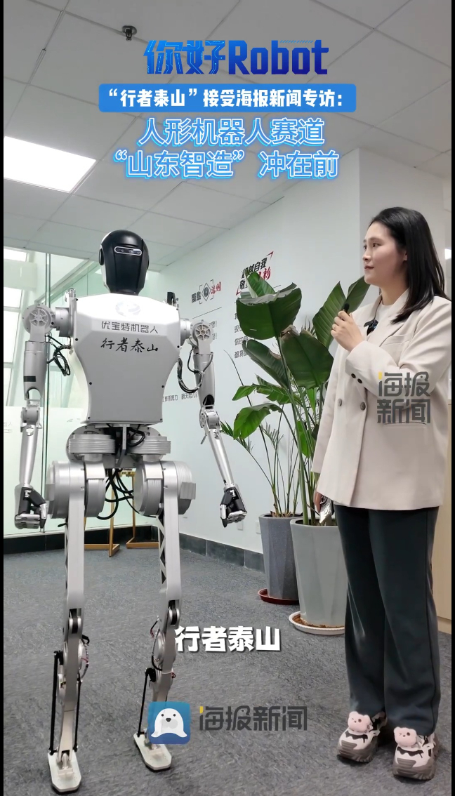 “你好,我在呢!”在山东优宝特智能机器人有限公司的实验室里,这个身高近1米7的人形机器人“行者泰山”热情地回应着记者的招呼。
