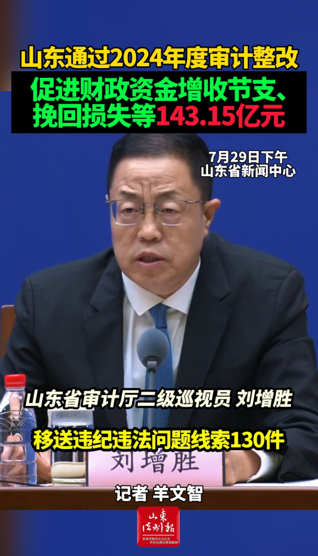7月29日下午,山东省政府新闻办举行新闻发布会,介绍山东2024年度省级预算执行和其他财政收支审计工作情况。山东省审计厅二级巡视员刘增胜会上介绍:“上一年度审计报告反映的问题已基本整改到位,通过审计整改,促进财政资金增收节支、挽回损失等143.15亿元,2024年,省本级向纪检监察机关和主管部门移送违纪违法问题线索130件,相关部门追责问责161人,其中党纪政务处分60人。”