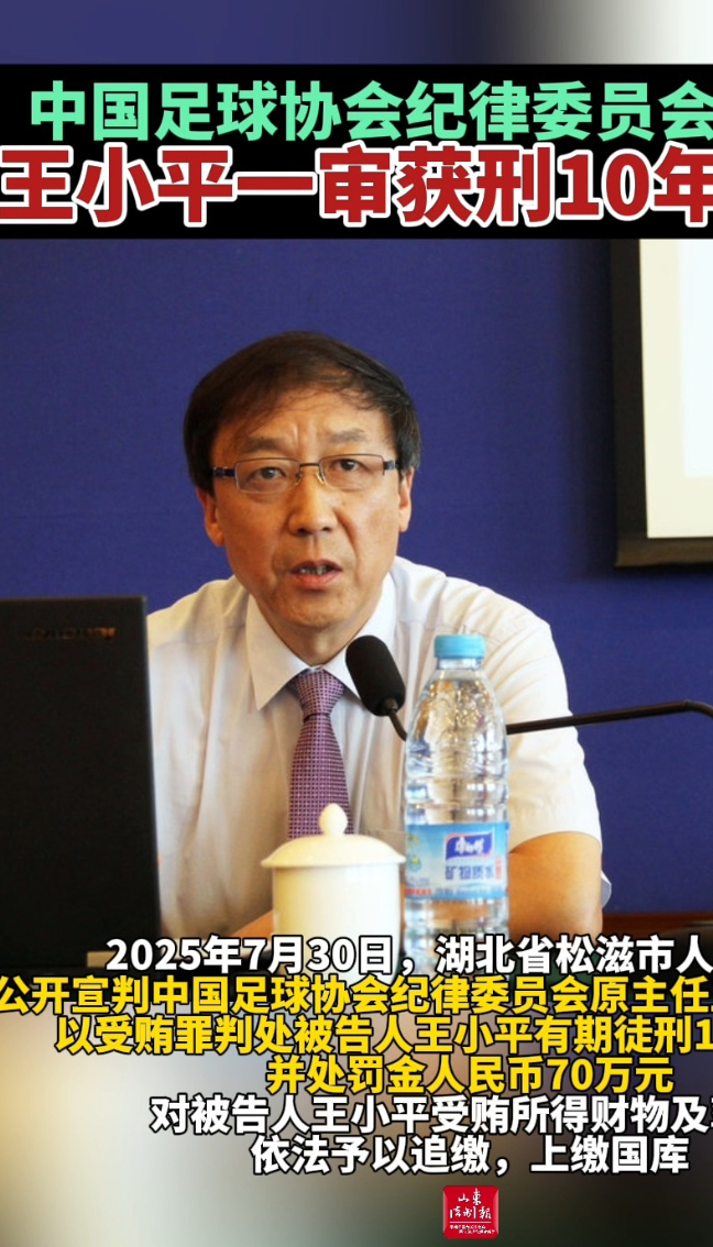 2025年7月30日,湖北省松滋市人民法院公开宣判中国足球协会纪律委员会原主任王小平受贿案,以受贿罪判处被告人王小平有期徒刑十年六个月,并处罚金人民币七十万元;对被告人王小平受贿所得财物及孳息依法予以追缴,上缴国库。