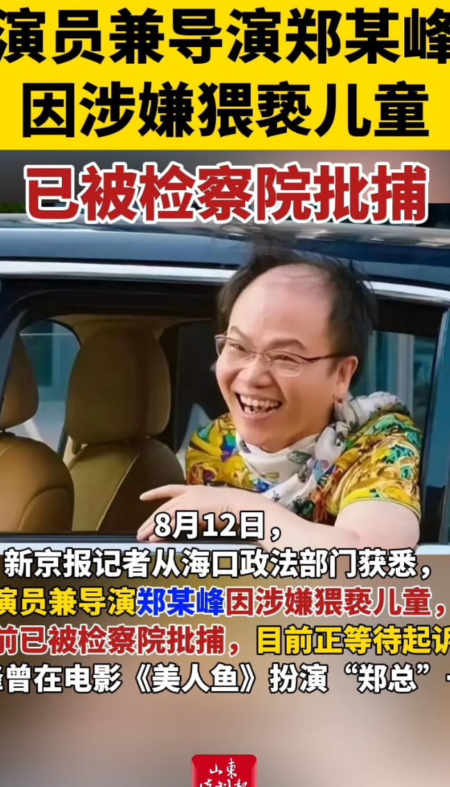 8月12日,新京报记者从海口政法部门获悉,演员兼导演郑某峰因涉嫌猥亵儿童,早前已被检察院批捕,目前正等待起诉。郑某峰曾在电影《美人鱼》扮演“郑总”一角。