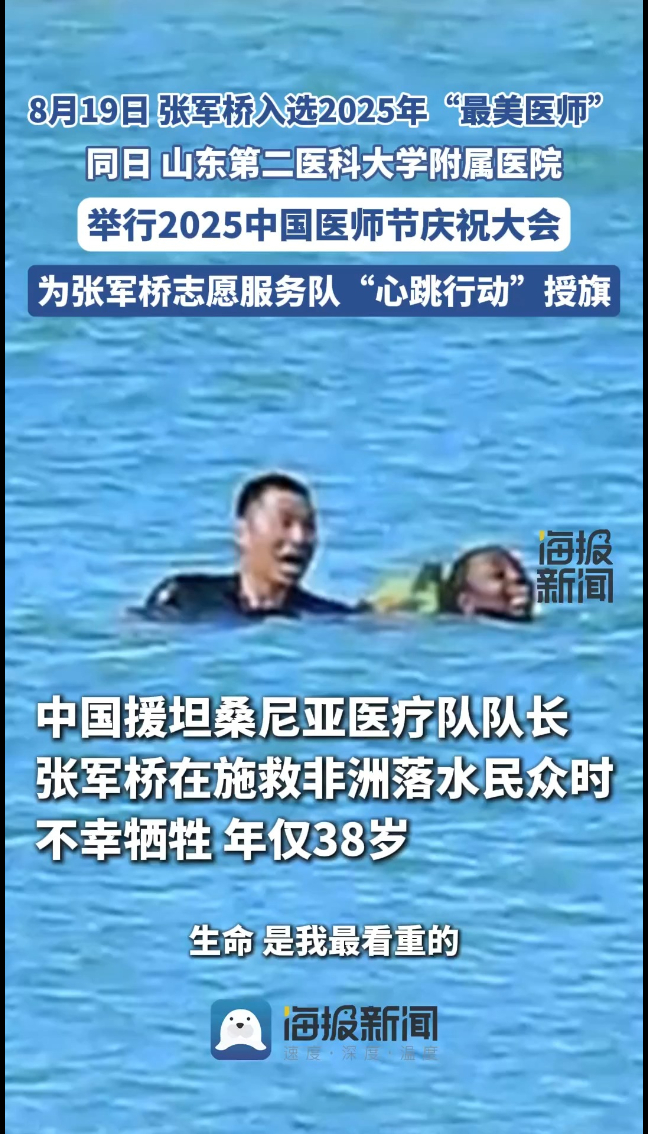 张军桥,生前系山东第二医科大学附属医院麻醉科副主任医师、山东第二医科大学麻醉学院教师,第27批援坦桑尼亚中国医疗队队长、临时党支部书记。2025年6月15号,他在坦桑尼亚施救当地一名落水民众,不幸牺牲,年仅38岁。张军桥英勇救人的事迹在国际社会引发强烈反响。在6月24日举行的外交部例行记者会上,新闻发言人郭嘉昆表示,张军桥同志为施救当地民众英勇牺牲,用生命践行中非友好合作精神,弘扬不畏艰苦、甘于奉献、救死扶伤、大爱无疆的中国医疗队精神。7月,张军桥被追授为“山东省道德模范”;8月被追授“齐鲁时代楷模”荣誉称号。