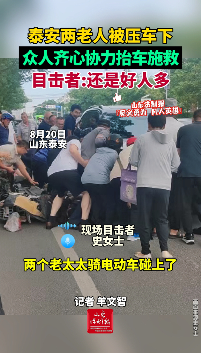 泰安两老人被压车下,众人齐心协力抬车施救 目击者:还是好人多