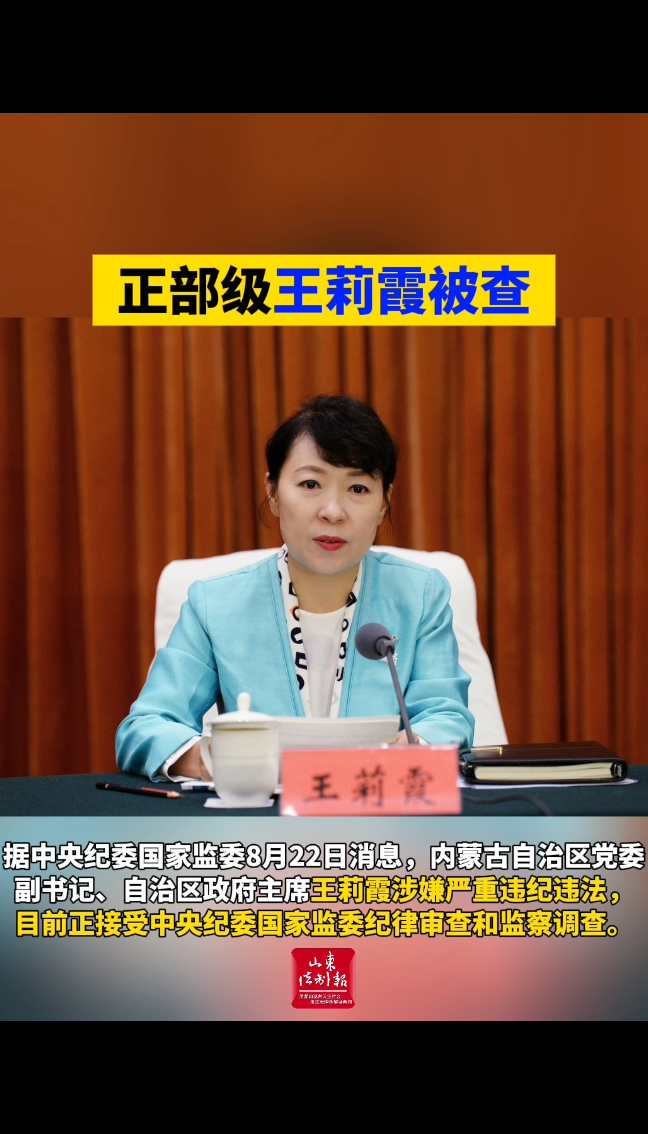 据中央纪委国家监委8月22日消息,内蒙古自治区党委副书记、自治区政府主席王莉霞涉嫌严重违纪违法,目前正接受中央纪委国家监委纪律审查和监察调查。