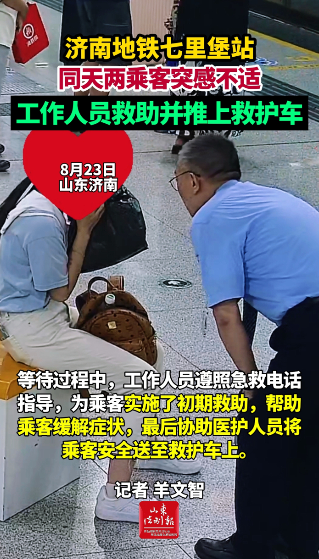 济南地铁七里堡站同天两乘客突感不适,工作人员救助并推上救护车