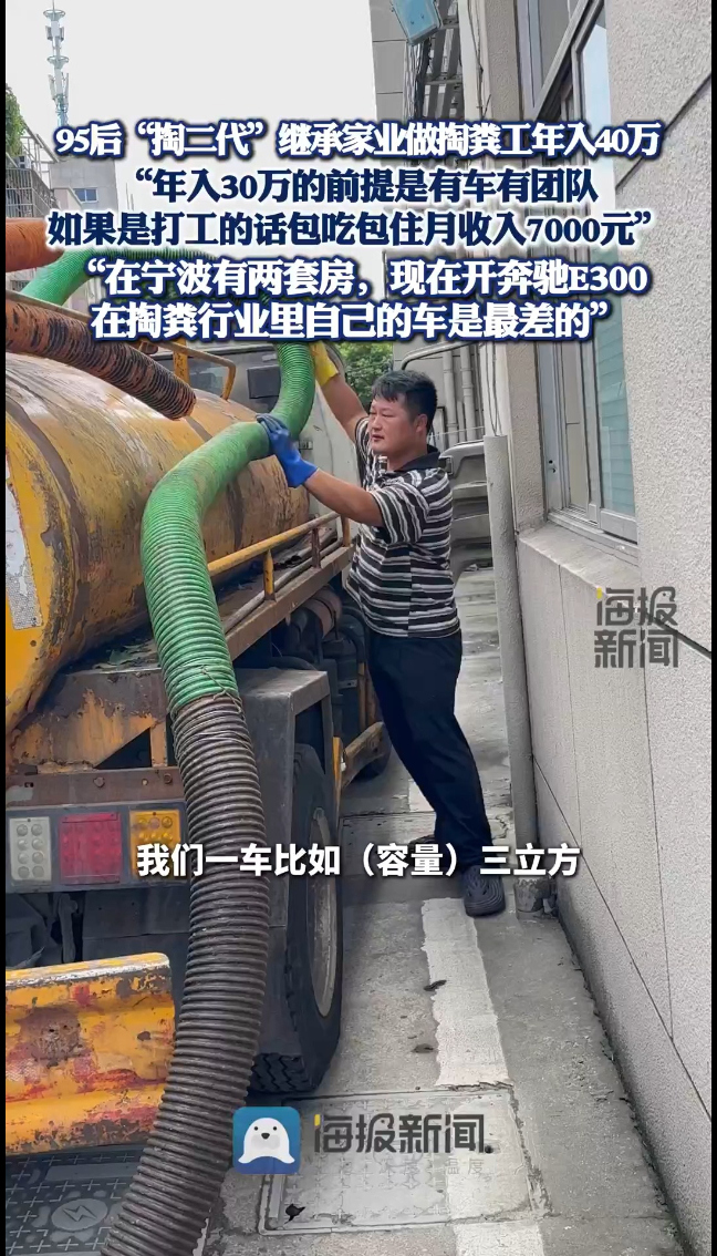 掏粪行业收入如何?潘浩南算了一笔账:慈溪地区单次抽粪价格平均为200元,一辆抽粪车平均每天能够作业5至10车,除去成本,年收入约40万元。“管吃管住,工人月薪7000多元,在当地算中上等,工作稳定。当然也没有网传‘5天工资8100元’那么夸张,有清运车的话收入会稍高些。我平时开的奔驰车是家里给我买的。”