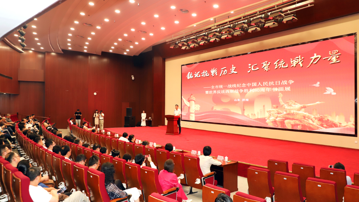 2025年8月29日上午,为纪念中国人民抗日战争暨世界反法西斯战争胜利80周年,由中共济南市委统战部主办,民盟市委会承办,济南市委台办、市委港澳办,市侨联,各民主党派市委会、市工商联协办的全市统一战线“铭记抗战历史 汇聚统战力量”书画展在山东新闻美术馆隆重启幕。此次展览旨在回望峥嵘岁月、致敬伟大胜利,激发全市统一战线成员的爱国情怀与民族自豪感,进一步凝聚新时代统一战线的奋进力量。