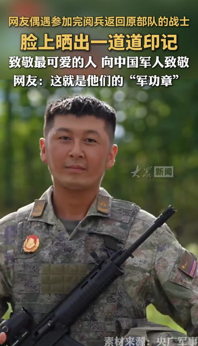网友偶遇参加完阅兵返回原部队的战士,脸上晒出一道道印记。致敬最可爱的人,向中国军人致敬!网友:这就是他们的“军功章”