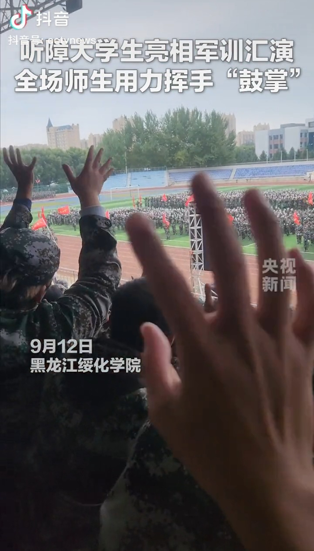 听障生方队在教官旗语指挥下,步伐整齐走过主席台,全场师生用摇手代替鼓掌