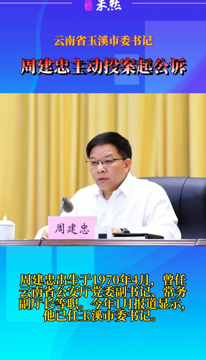 观政视频|云南省玉溪市委书记周建忠主动投案 2025-09-25 原创齐鲁晚报·齐鲁壹点客户端 微信扫码扫码下载客户端中央纪委国家监委网站9月25日消息,云南省玉溪市委书记周建忠涉嫌严重违纪违法,主动投案,目前正接受云南省纪委监委纪律审查和监察调查。