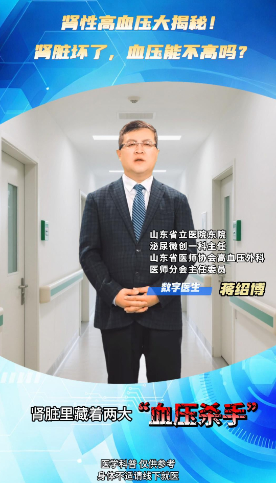 本期将揭秘第一位“血压杀手”——肾实质性疾病。通过一个10岁男孩眼部浮肿、血压飙升的真实病例,山东省立医院东院泌尿微创一科主任、山东省医师协会高血压外科医师分会主任委员蒋绍博将为您生动比喻:肾脏如何像身体的“智能排水系统”。一旦因肾炎等疾病受损,将导致“水钠潴留”,从而引爆高血压。此类高血压的治理关键在于修复肾脏本身,从病根入手,血压有望不药而愈。(大众新闻记者 周欣怡 策划 李丽)