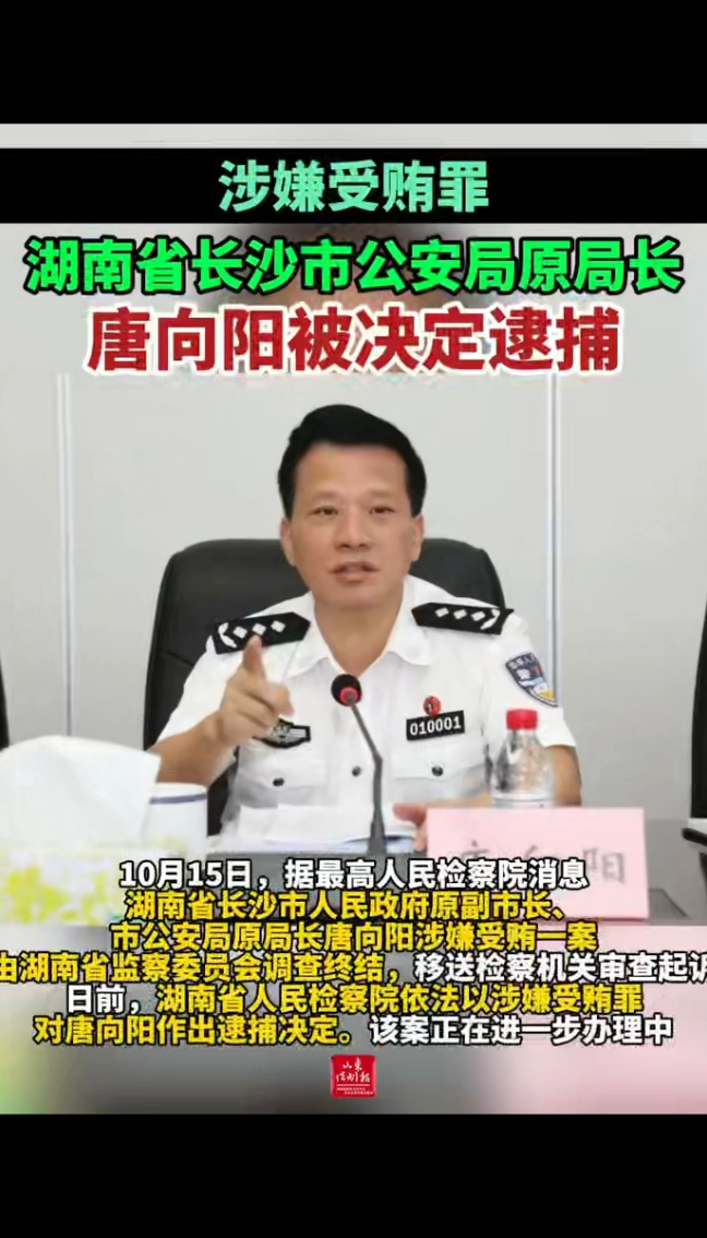 涉嫌受贿罪,湖南省长沙市人民政府原副市长、市公安局原局长唐向阳被决定逮捕