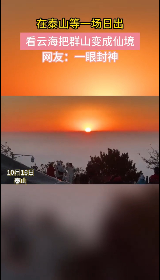 快看!10月16日,泰山之巅上演神仙场面!翻滚的云海稳稳托起一轮金色太阳,霞光像打翻的颜料桶,把天空染成梦幻画卷!游客们都看傻了,这不就是“会当凌绝顶,一览众山小”的顶级浪漫吗?