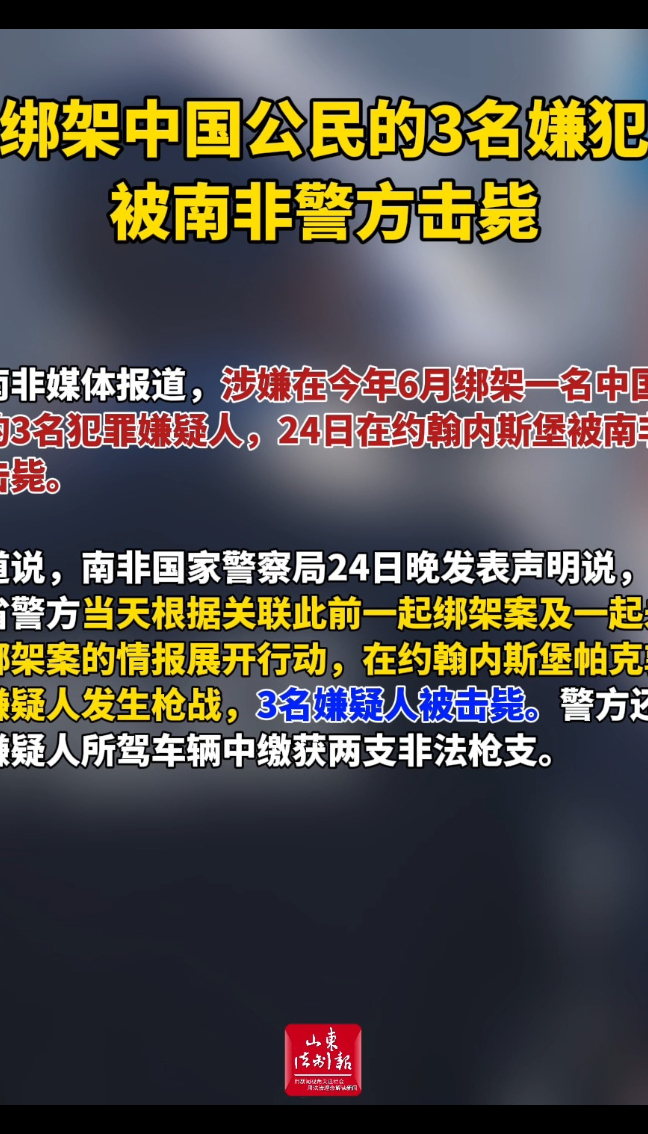 据南非媒体报道,涉嫌在今年6月绑架一名中国公民的3名犯罪嫌疑人,24日在约翰内斯堡被南非警方击毙。