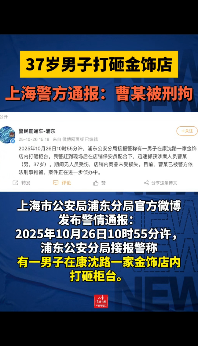 37岁男子打砸金饰店,上海警方通报:曹某被刑拘 2025-10-26 大众新闻·山东法制报 微信扫码扫码下载客户端上海市公安局浦东分局官方微博发布警情通报:2025年10月26日10时55分许,浦东公安分局接报警称有一男子在康沈路一家金饰店内打砸柜台。民警赶到现场后在店铺保安员配合下,迅速抓获涉案人员曹某(男,37岁)。其间无人员受伤,店铺内商品未受损失。目前,曹某已被警方依法刑事拘留,案件正在进一步侦办中。