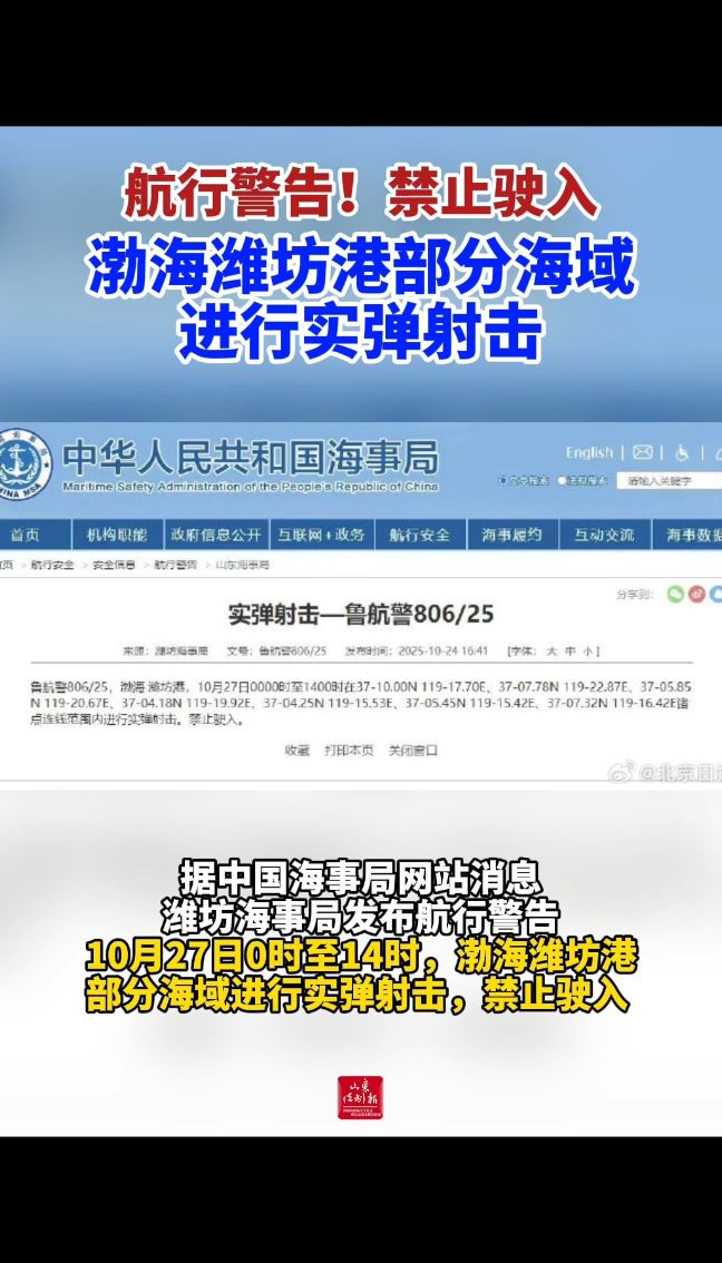 航行警告,禁止驶入!渤海潍坊港部分海域进行实弹射击 2025-10-27 潍坊海事局 微信扫码扫码下载客户端据中国海事局网站消息,潍坊海事局发布航行警告,10月27日0时至14时,渤海潍坊港部分海域进行实弹射击,禁止驶入。
