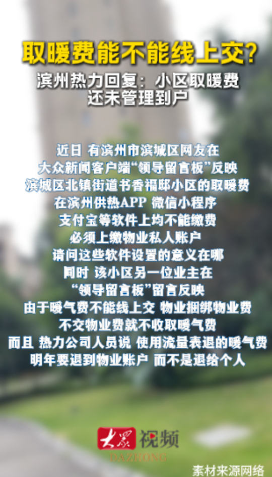 近日,有滨州市滨城区网友在大众新闻客户端“领导留言板”反映:滨城区北镇街道书香福邸小区的取暖费,在滨州供热APP、微信小程序、支付宝等软件上均不能缴费,必须上缴物业私人账户,请问这些软件设置的意义在哪?